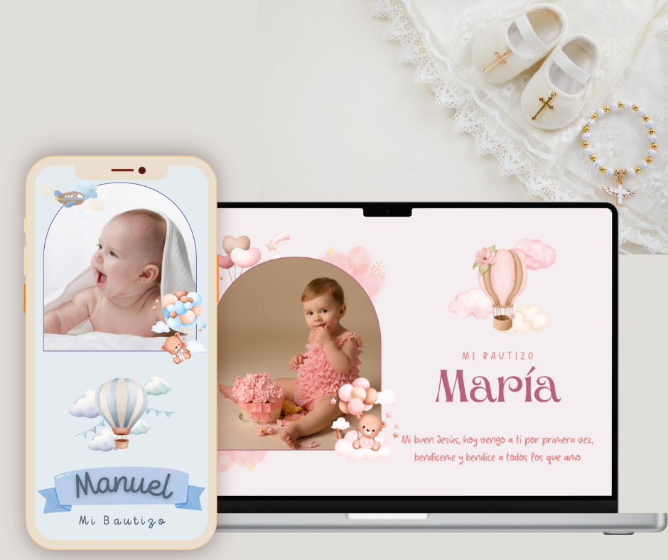Aquí encontraréis invitaciones digitales llenas de dulzura y encanto, diseñadas para anunciar este día tan especial con la delicadeza que él o ella merece.